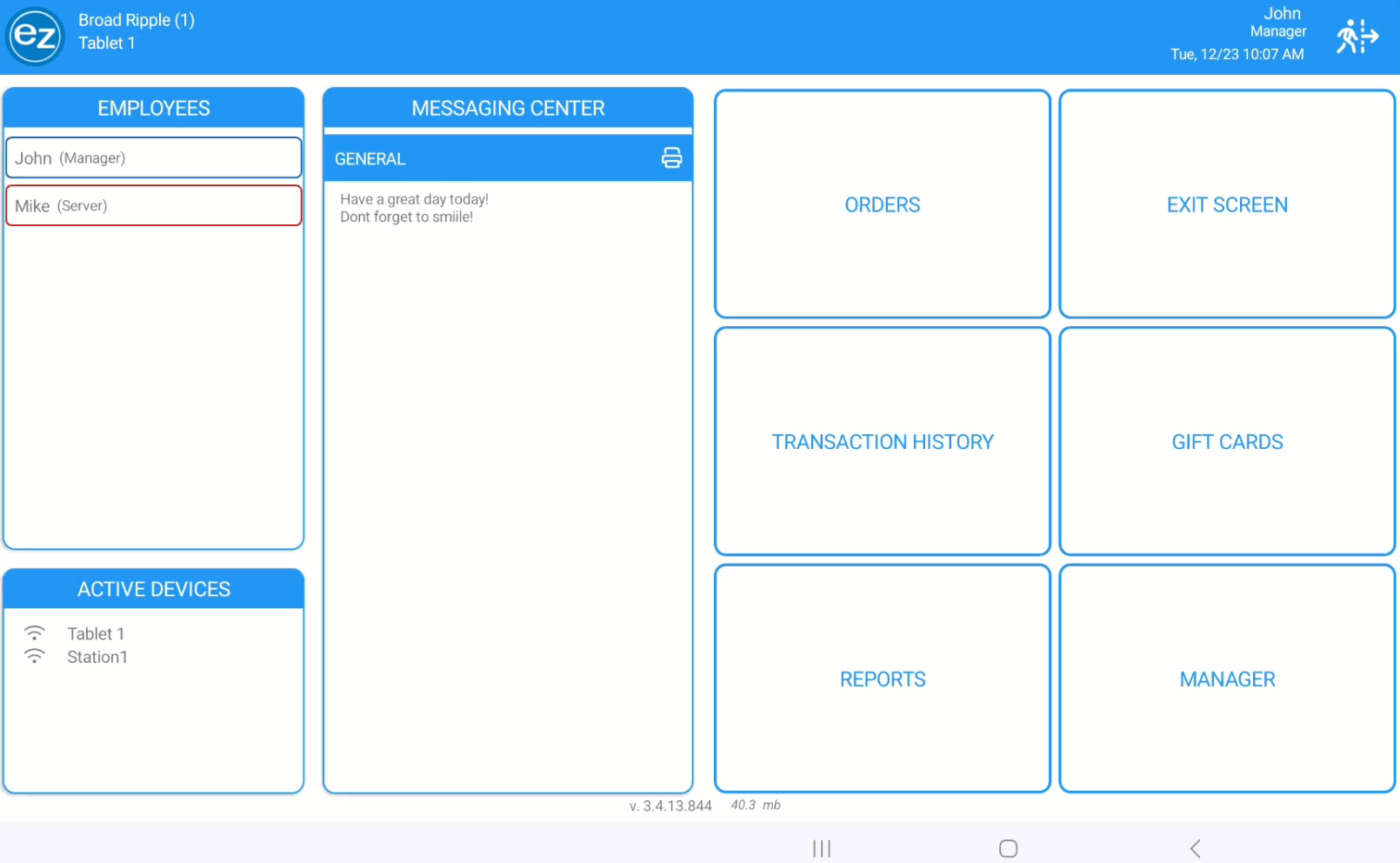 - Once the tablet has been successfully registered you will now be on EZ Dine app main login page. From the login page employees will have the ability to clock in/out, break in/out, and use the device