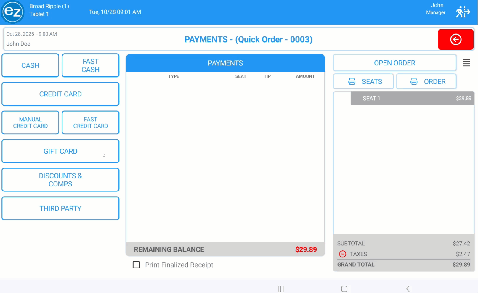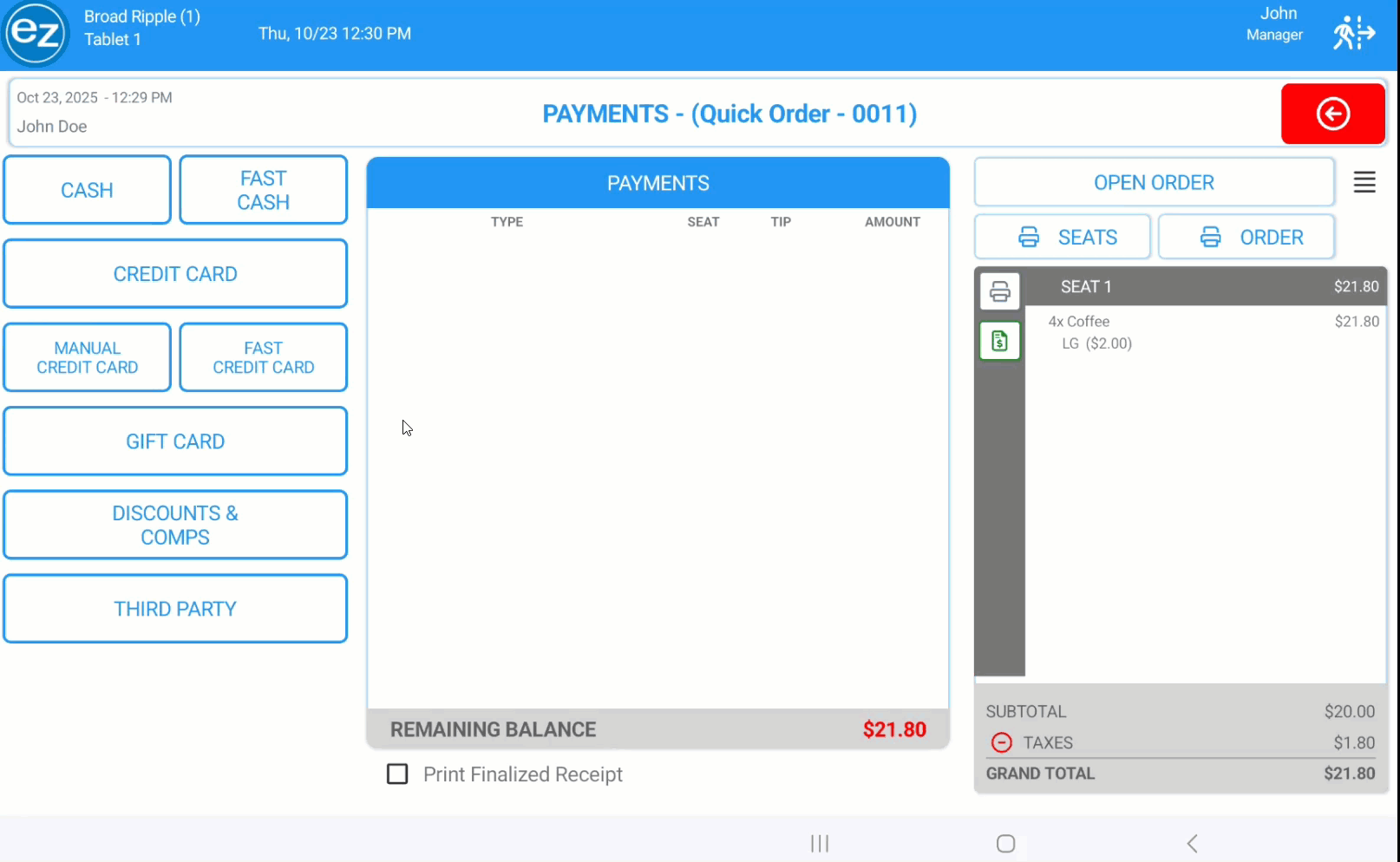 - From the payment page you will be able to organize items, print receipts, modify the order total, and finalize the transaction