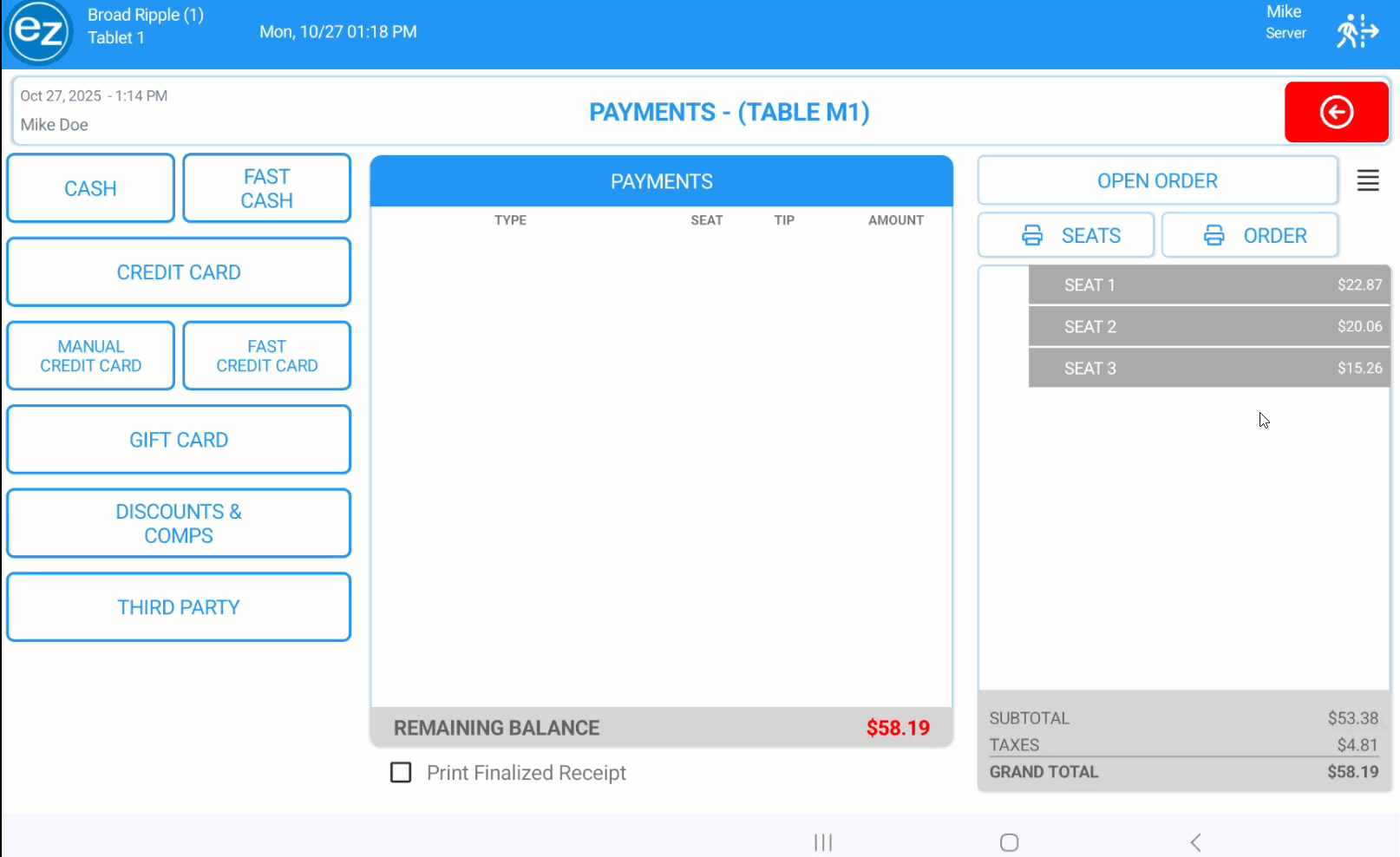 - For printing a single customer receipt for the entire order can be done by selecting the print order tab. This will print one receipt listing each seat's total individually on the receipt