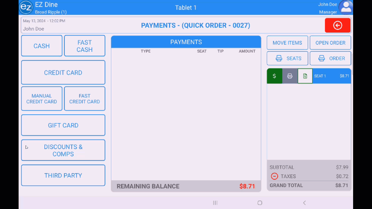 - Once selected the discount and comp type, amount, and seat number will be listed inside the order payment window