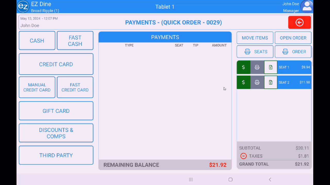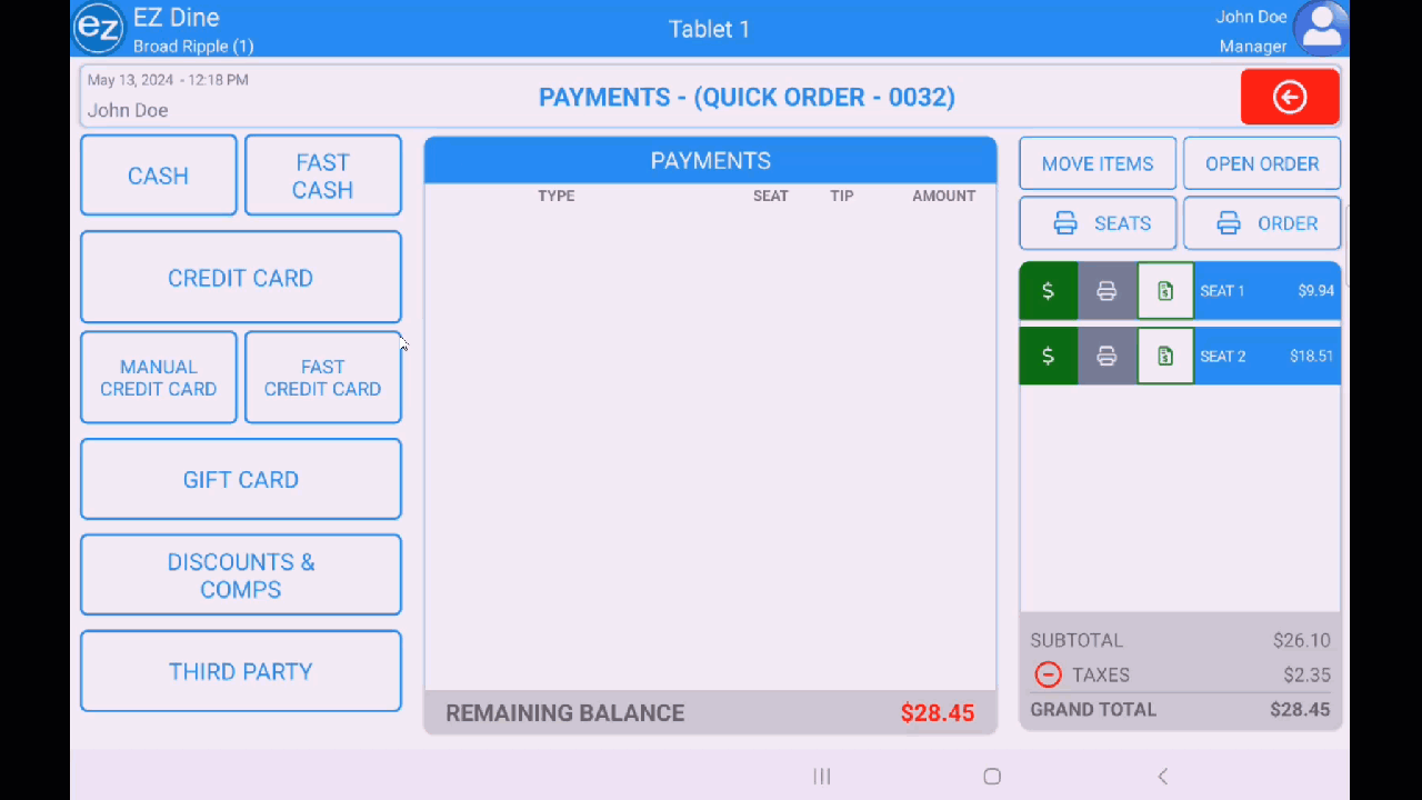 - Adding separate seats to the order will allow for the ability to apply separate payments by the seat