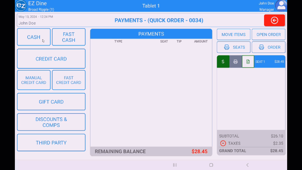 - Select the payment method and tap the seat number header. Or seat number header and then payment method to apply the seat total amount. Enter the cash amount on the number pad and press add payment for cash. For credit card select process credit card and that exact seat balance amount will be used for payment
