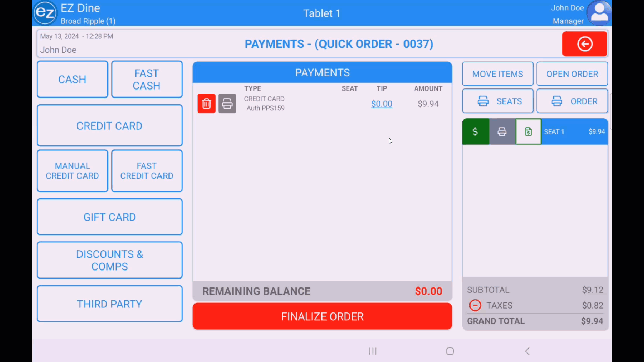 - To complete the order select the red finalize order button at the bottom of the page. The finalized order will change to processing payment indicating the payment and transaction information is being synced back to EZ Dine Studio