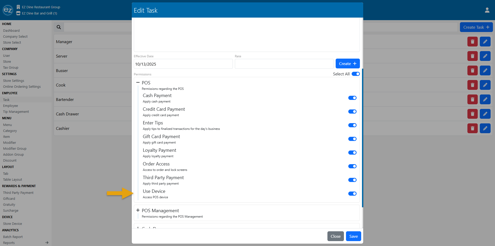 Accessing the POS device will require the assigned employee task to have the Use Device permission turned on from Studio
