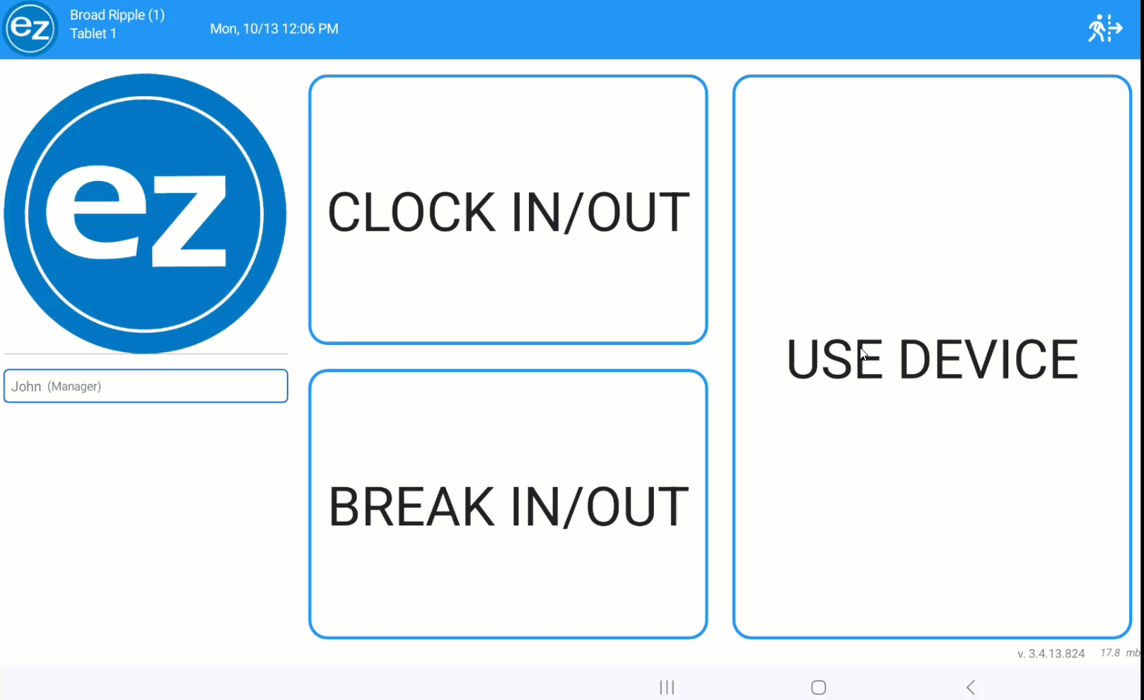 - Listed on the top header will be the EZ Dine app logo, store name/number, device name, current date and time, employee who is currently logged into the device, and exist screen icon located at the top right hand corner