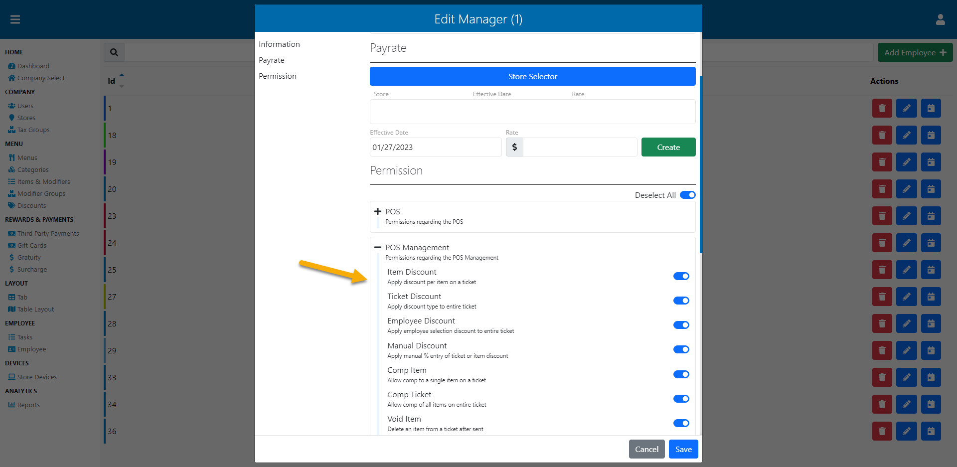 For detailed instructions on discounts, comps, and voids setup please reference the Studio articles found here Studio Discount Setup Studio Comp Setup Studio Void Reason Setup Employee permissions will be needed to apply item discounts, comps, and voids![]()