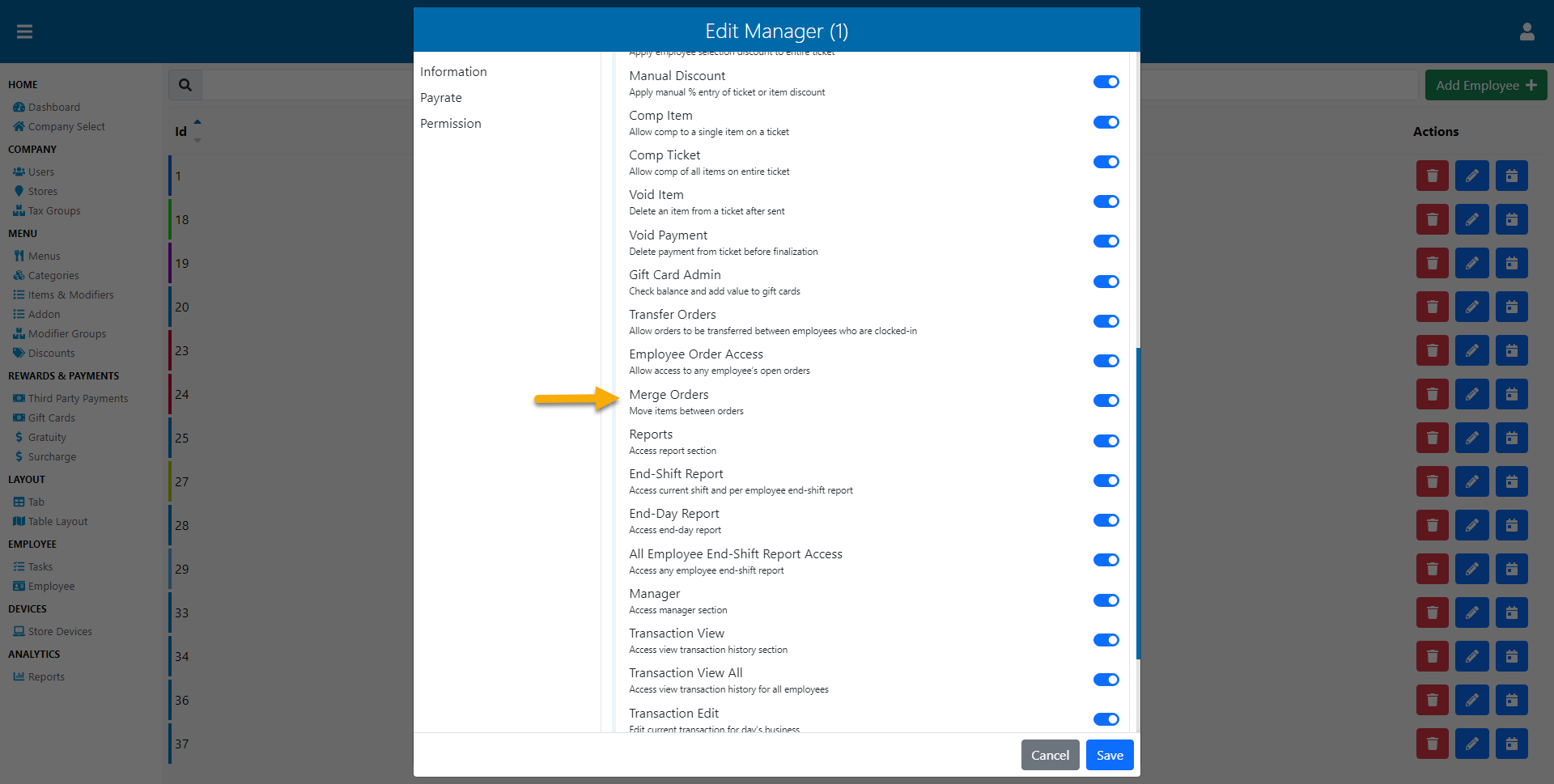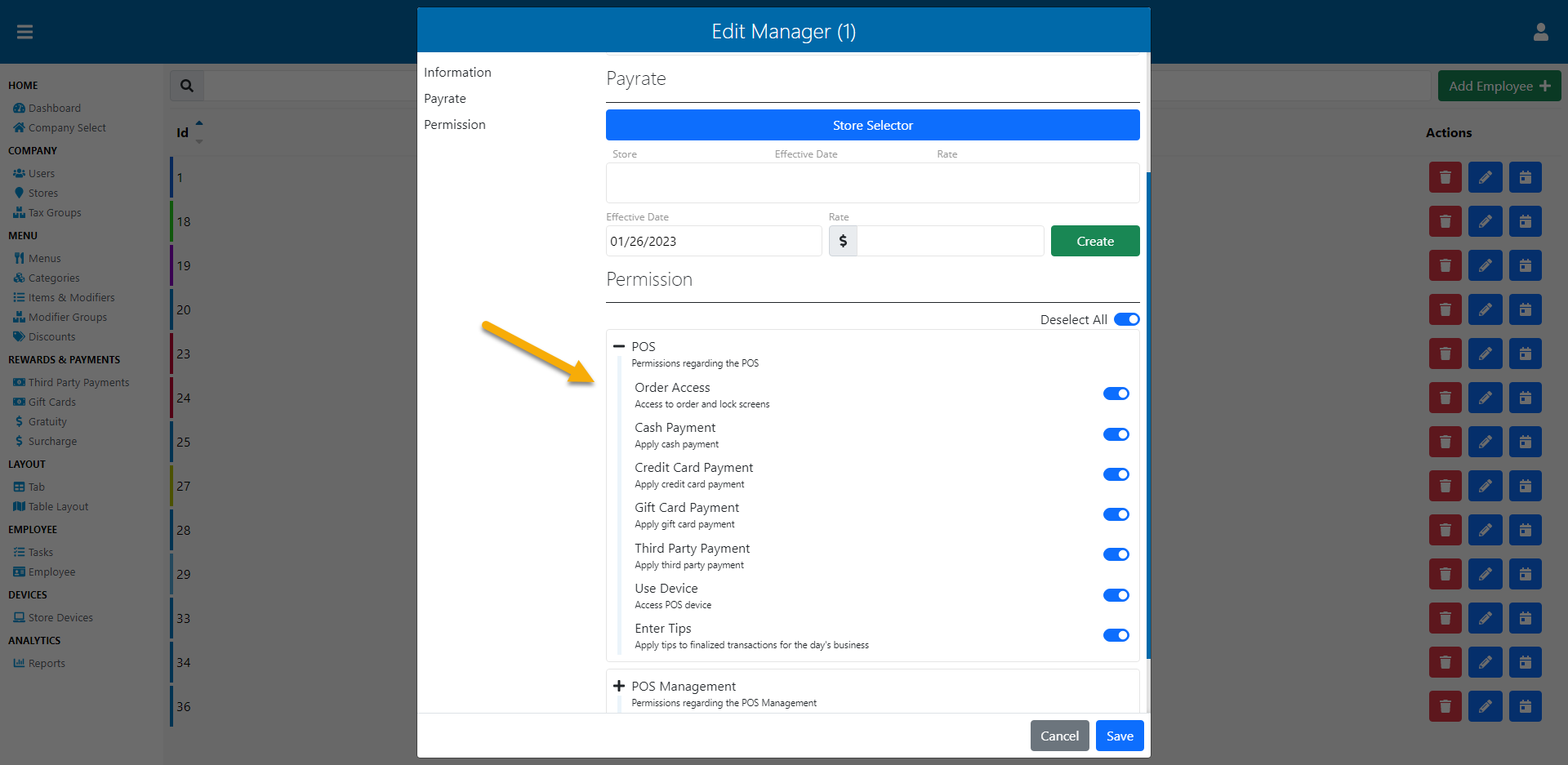 Accessing the order section will require the employee to have order access permission turned on from Studio
