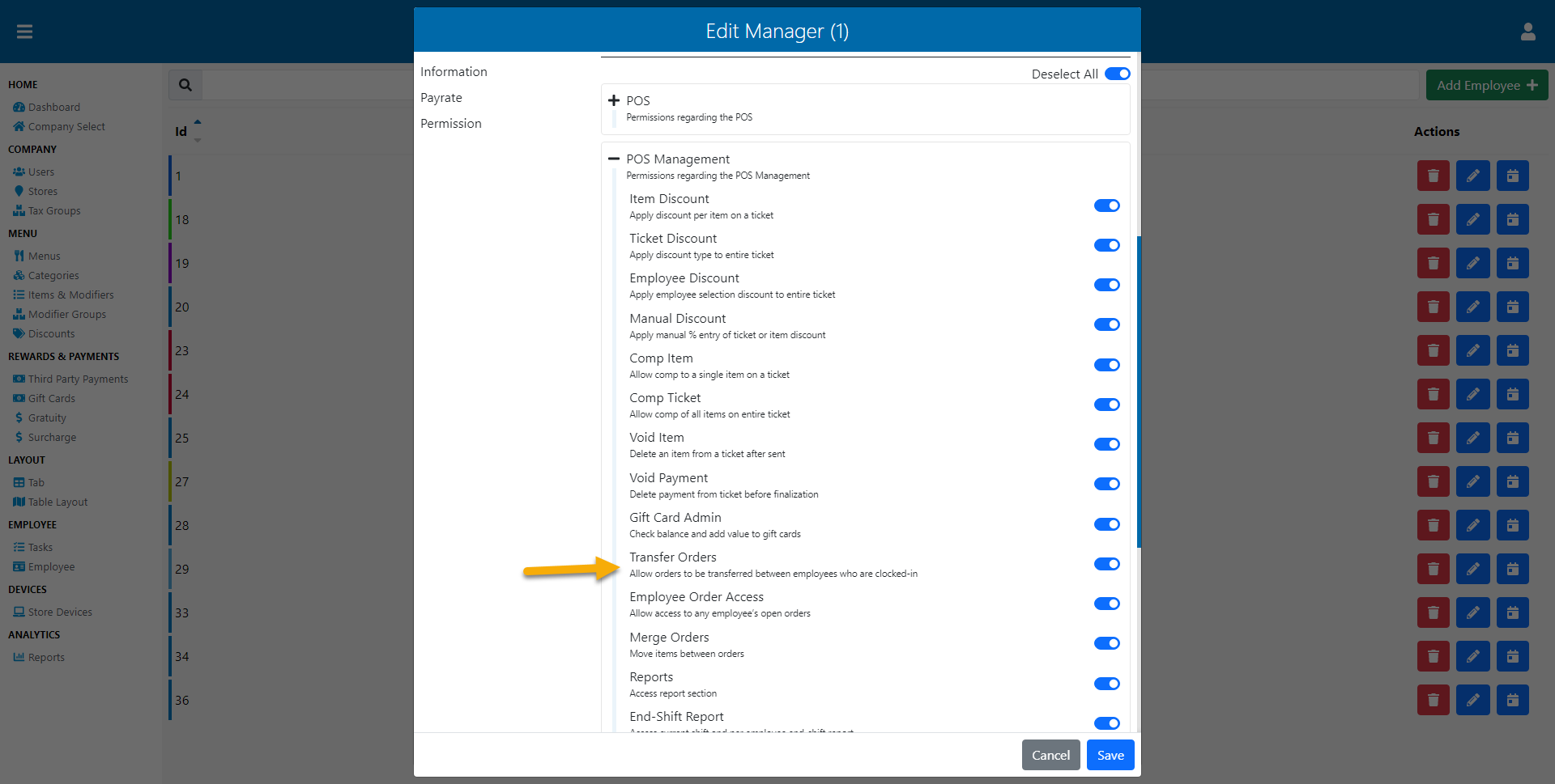 - Selecting cancel on the transfer order window will close the employee selections and return back to the menu/order page