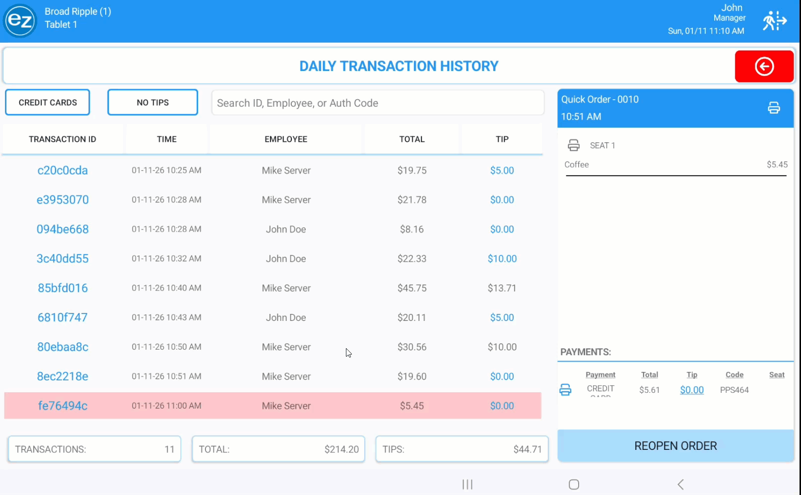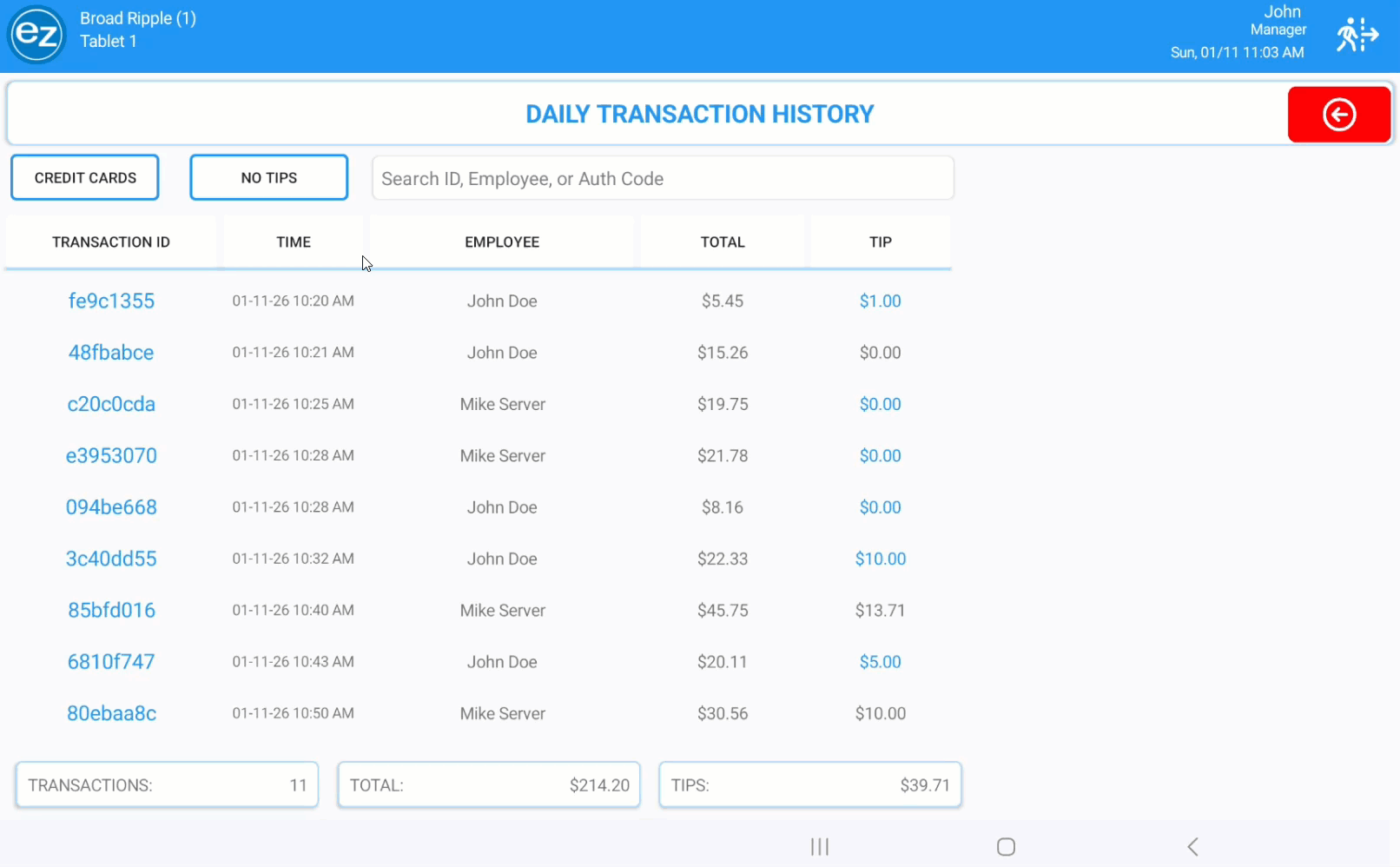 - Transactions can be filtered based on credit card payments with or without tips applied