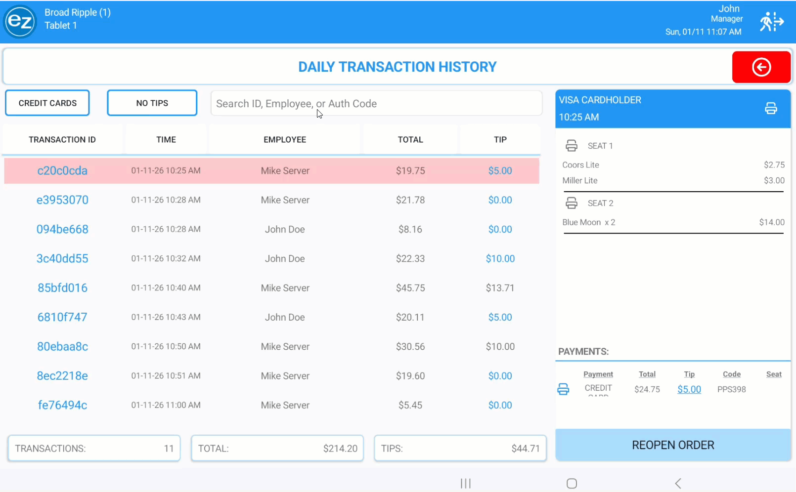 - The reopened transaction will be created and stored inside the previous transaction tab ordering section. The tab will be identified with [REOPENED] after the order name