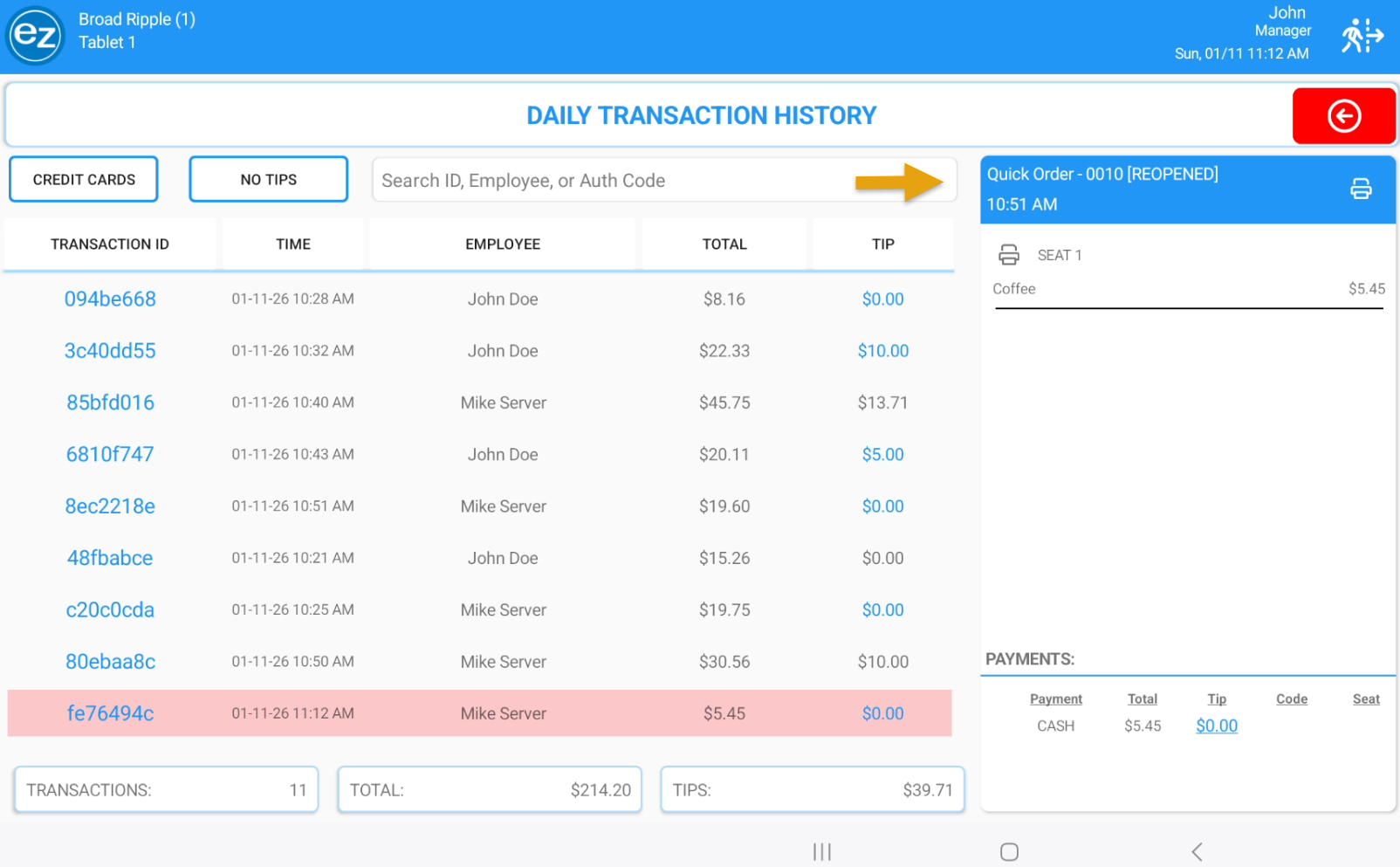 - Search transactions based on the transaction id, employee name, or credit card authorization code. This transaction information will be listed on the credit card and finalized receipts