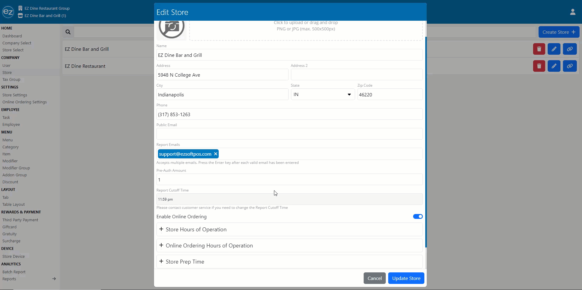 - Enabling online ordering: Determines if the store assigned to the company will be active and displayed as an online ordering store. If a store is closed but still active then using the online hours to control visibility is recommended