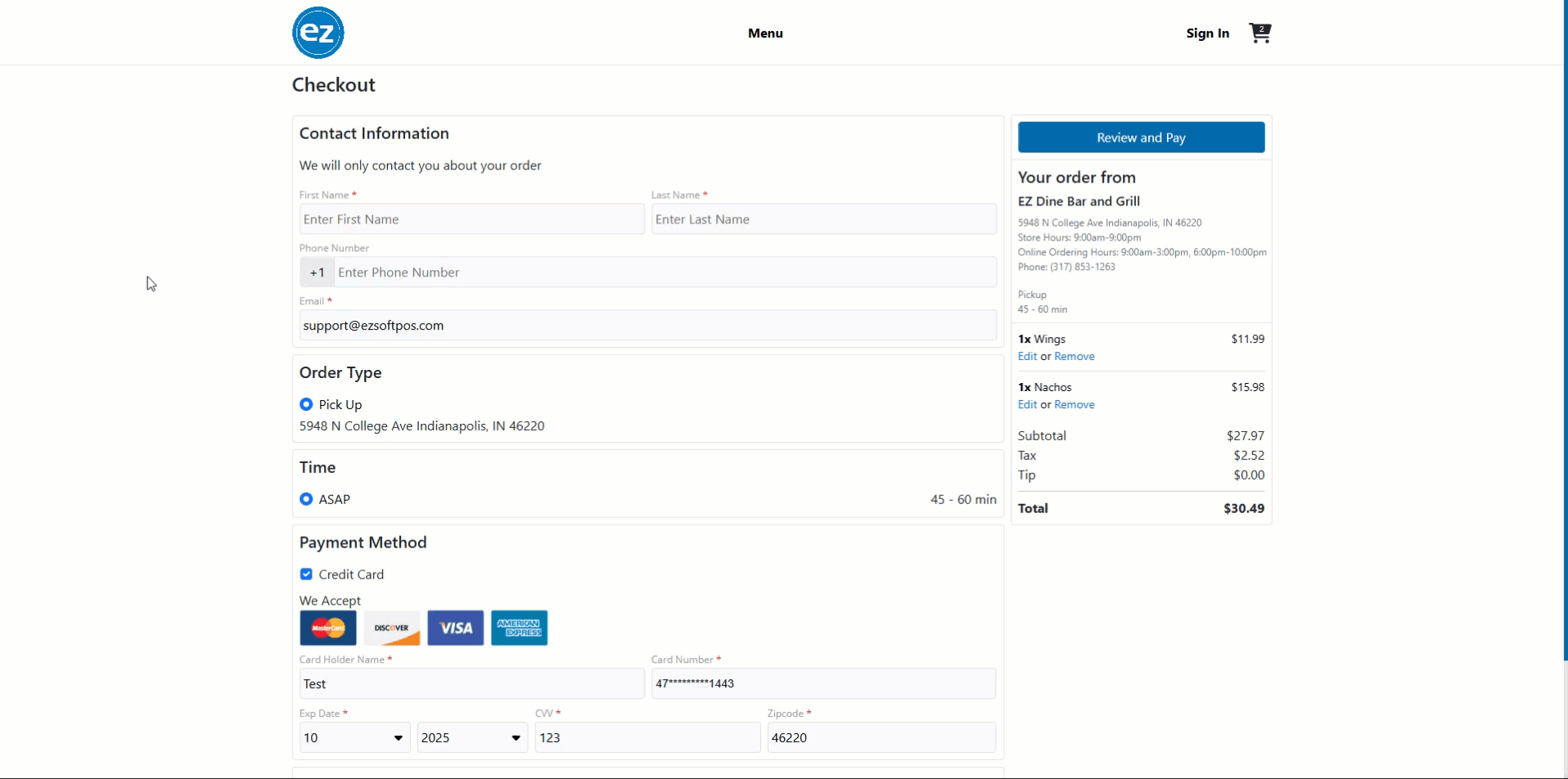 - Select review and pay and this will complete the order and sync the order to the EZ Dine app