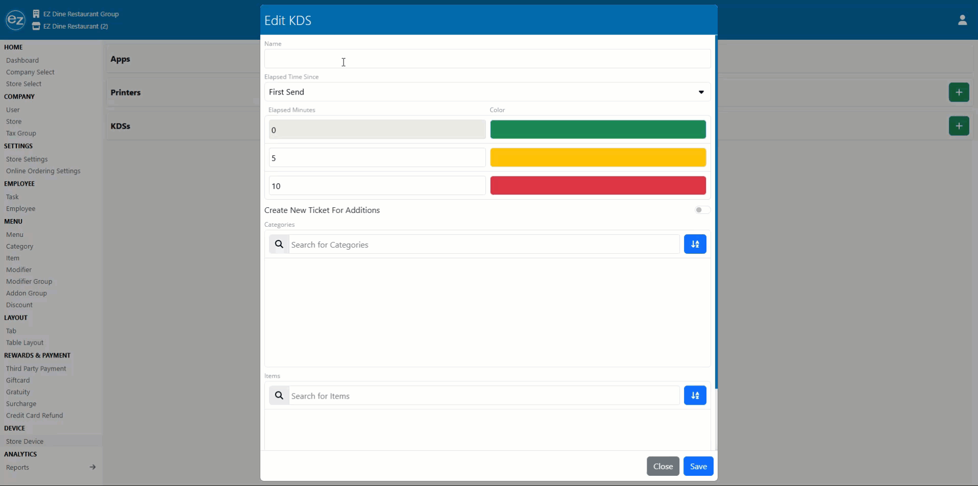 - Assign which categories and items will be routed to the KDS device