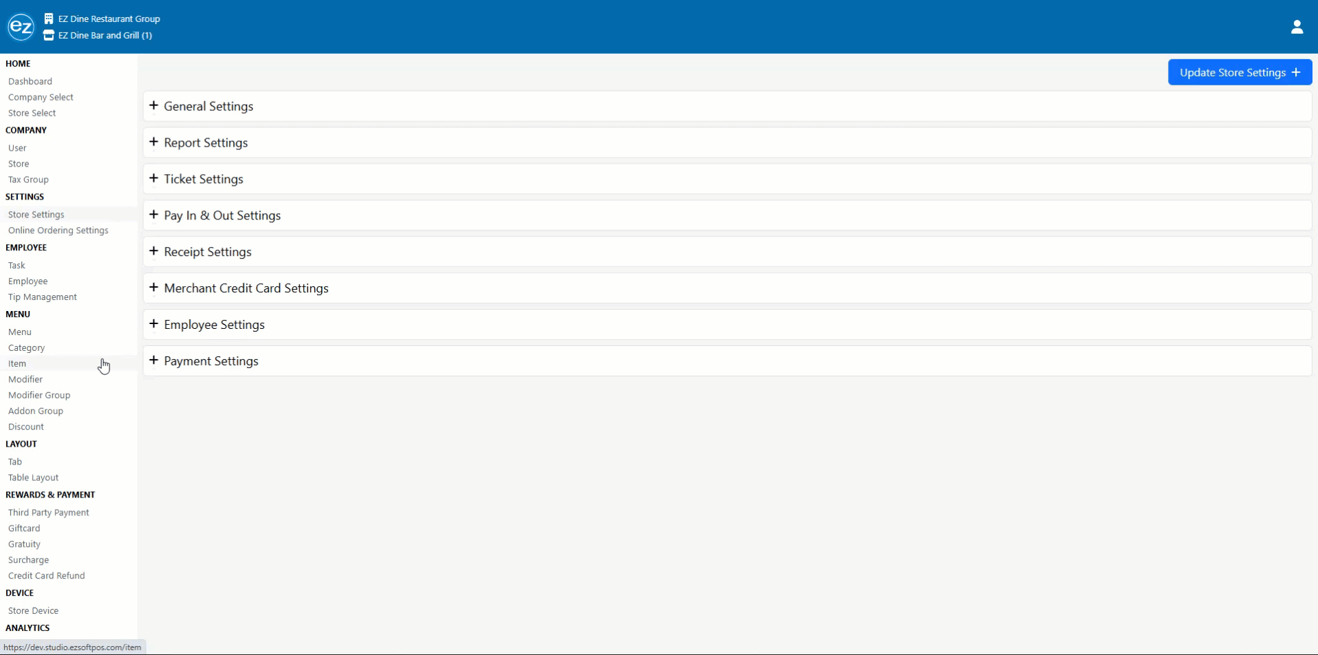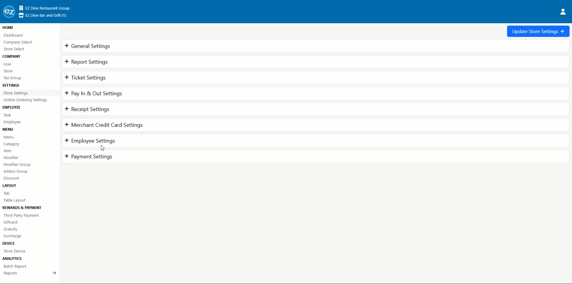 The store settings section will list configurable and customizable options used by the EZ Dine App per location For details on the online ordering settings please reference the online ordering article section found here Online Ordering Settings
