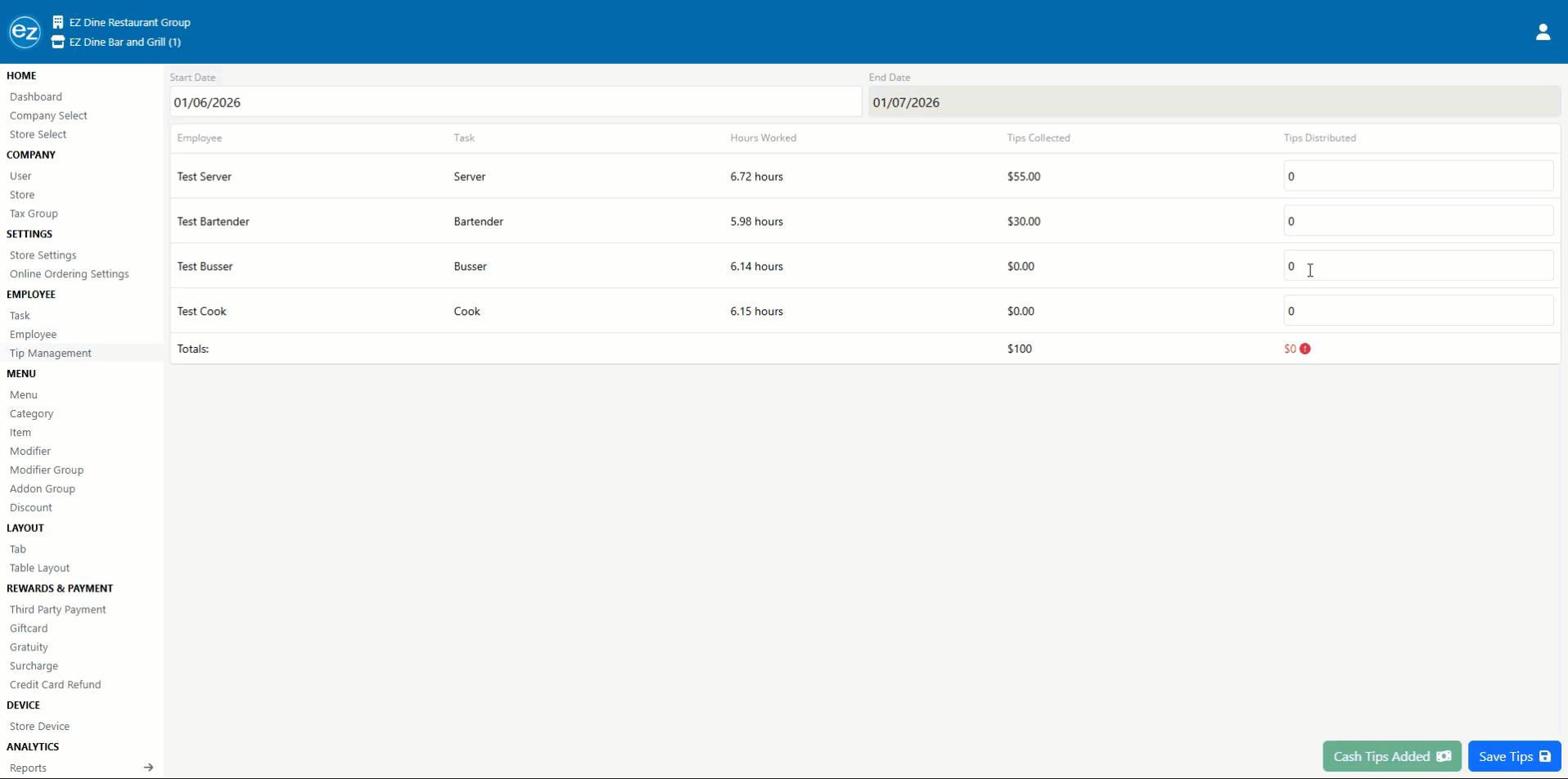 - The total amount of payment tips collected must be equal to the total amount of tips being distributed