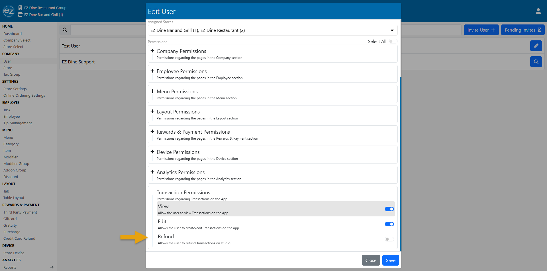 For accessing the credit card refund section. Studio users will need the refund transaction permission turned on. Credit card refunds will issue a return credit amount back to the customers credit card. The refunded total amount will be processed during the daily batch settlement time. Only full refunds for the entire credit card payment amount will be available for processing