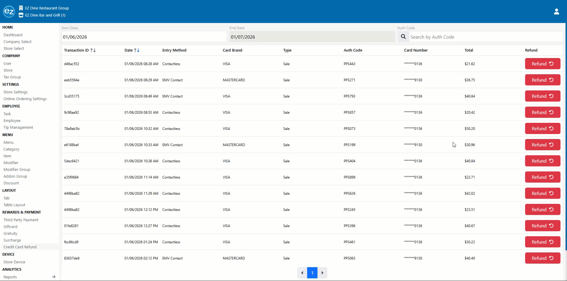 - Each credit card payment will be sorted by the transaction id, date/time, entry method, card brand, entry type, auth code, card number, and total payment amount