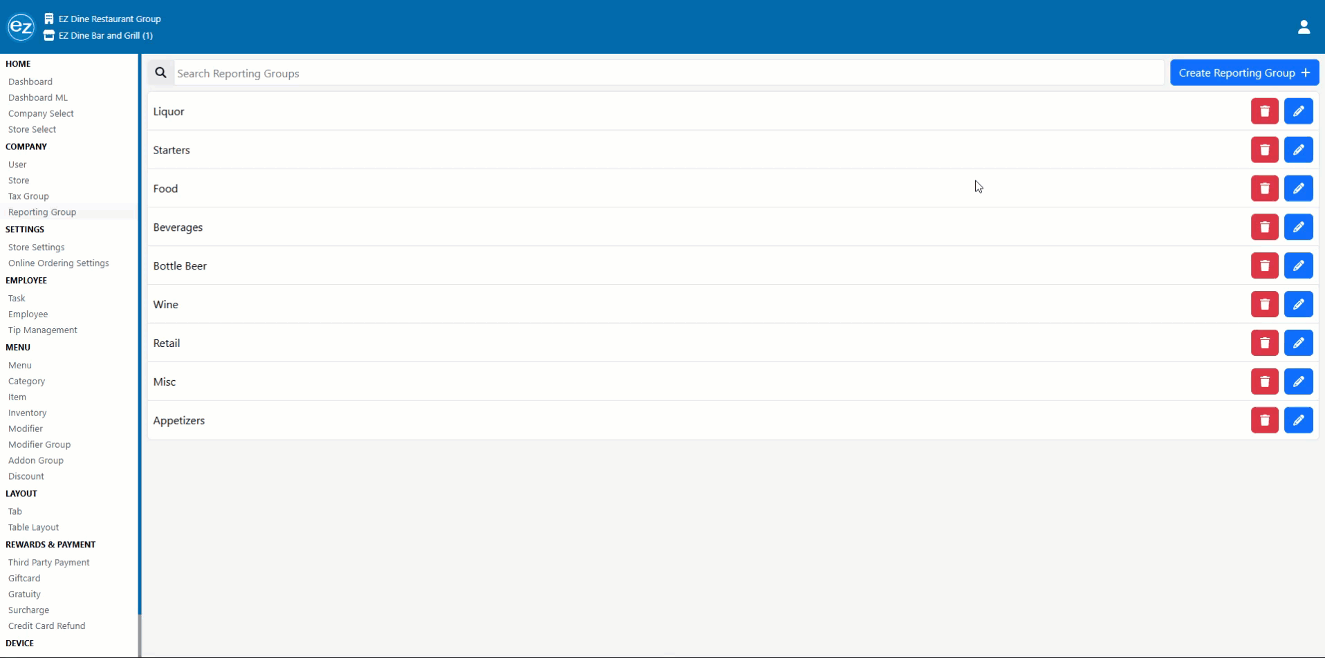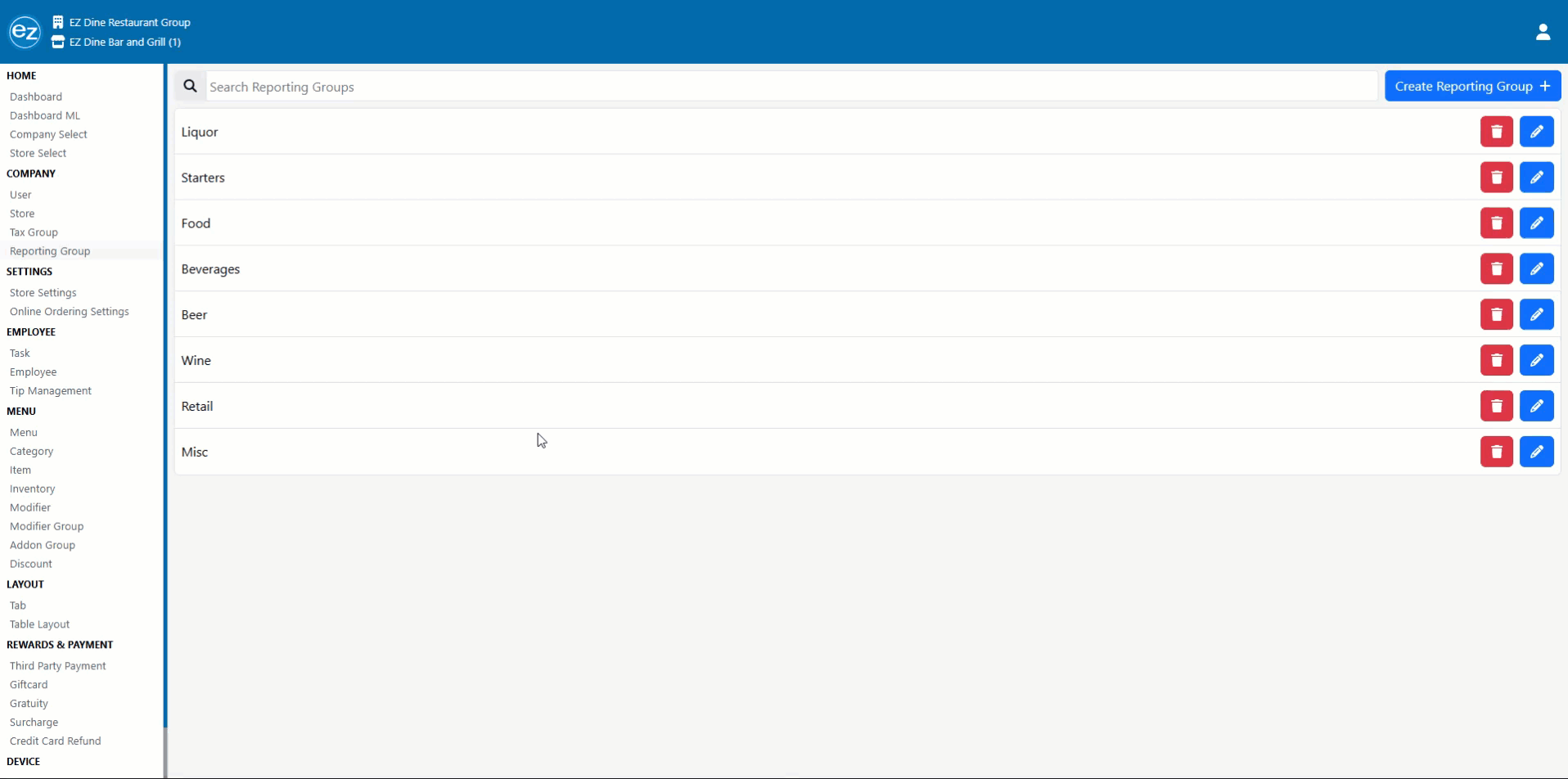 - The default reporting group list will be Food, Beverages, Beer, Liquor, Wine, Retail, and Misc. You will have the ability to search, edit, delete, and create new groups
