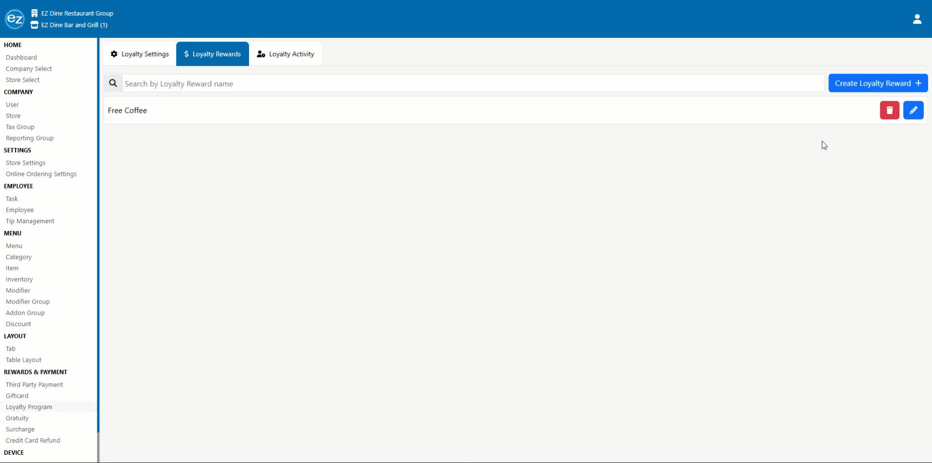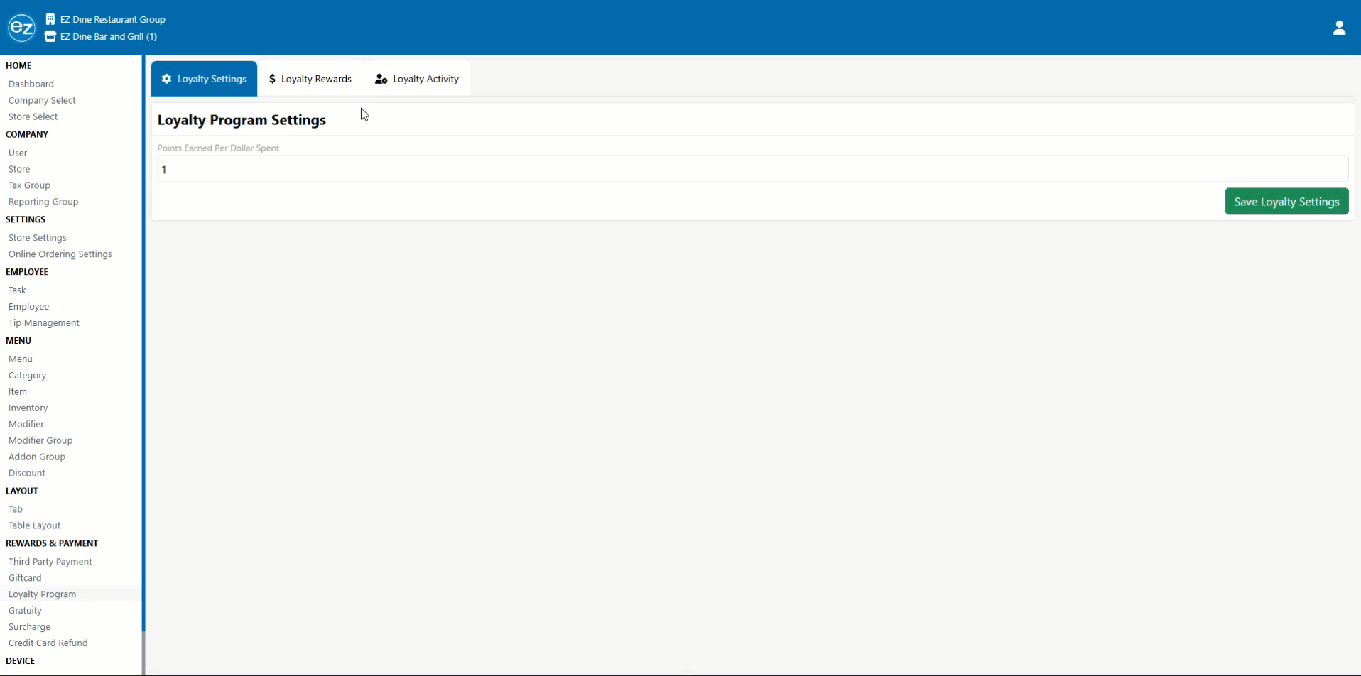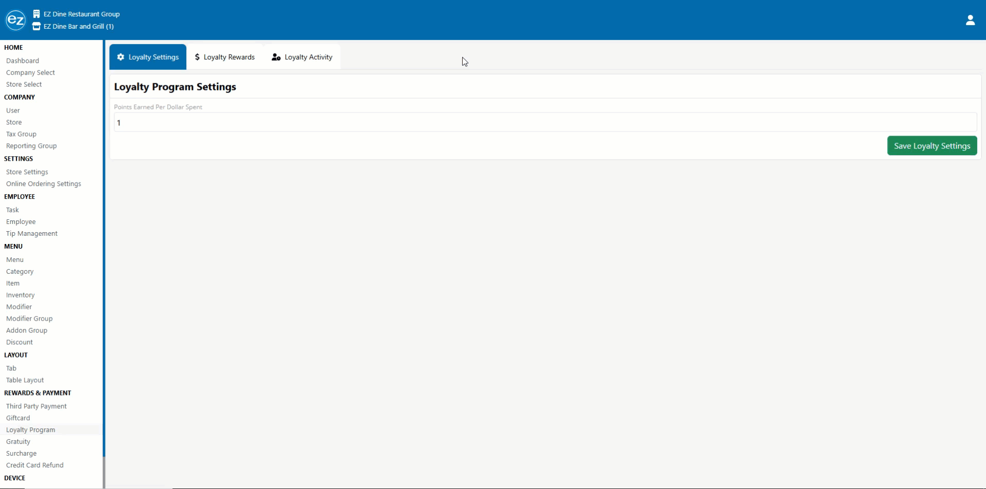 The loyalty rewards system will need to be enabled on your company by an EZ Software administrator. Once activated a new loyalty program page will be listed inside the rewards & payment section. Existing reward systems can be imported by providing a google/excel sheet of the customers phone number, current points balance, and first and last name