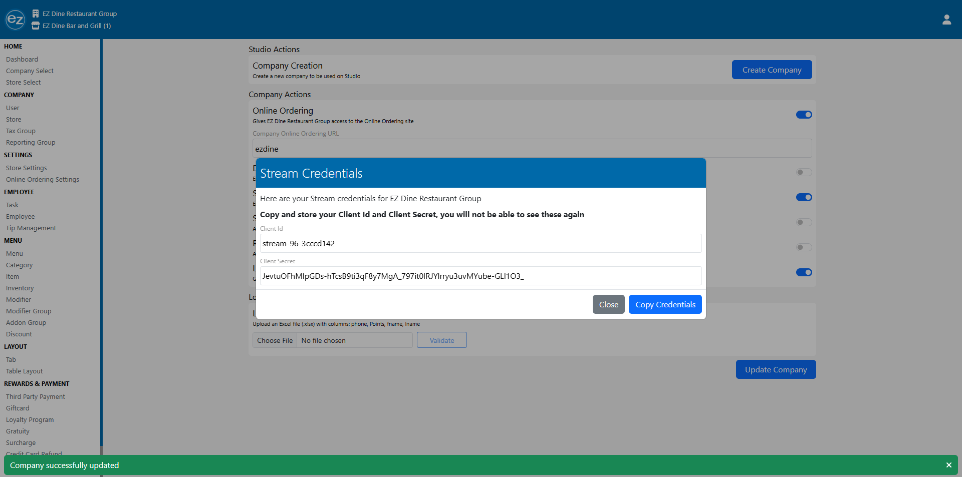 - Once the Stream company setting is enabled a unique client id and secret will be generated. The client id and secret should be saved as this will be needed to connect your EZ Dine company information over to Stream