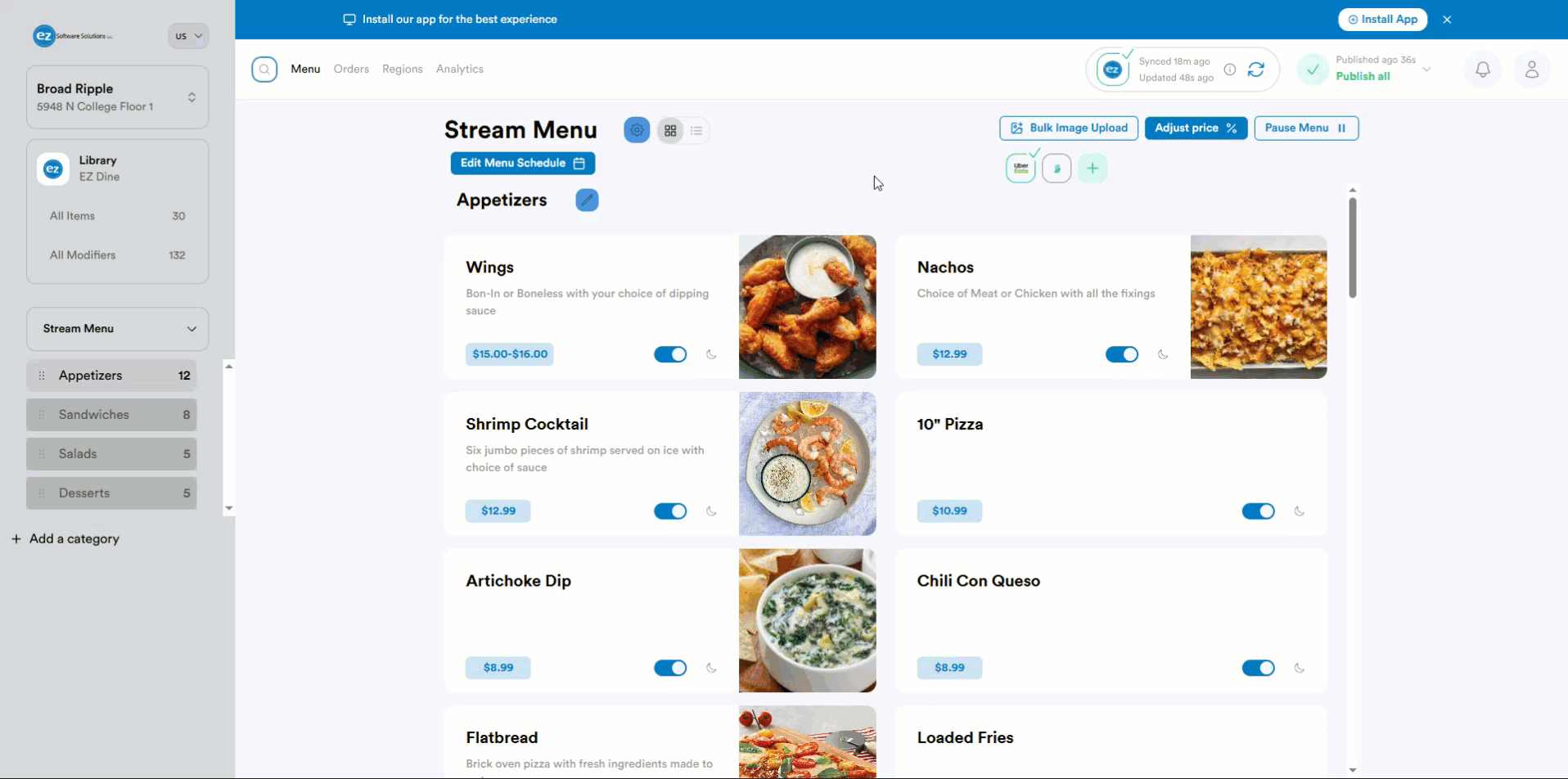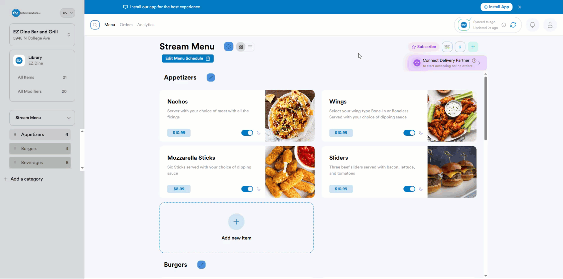 - The majority of menu edits should be completed on Studio and resynced over to Stream. You will not be able to create new items or modifiers directly through Stream