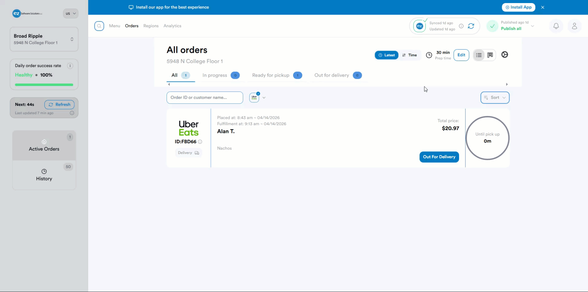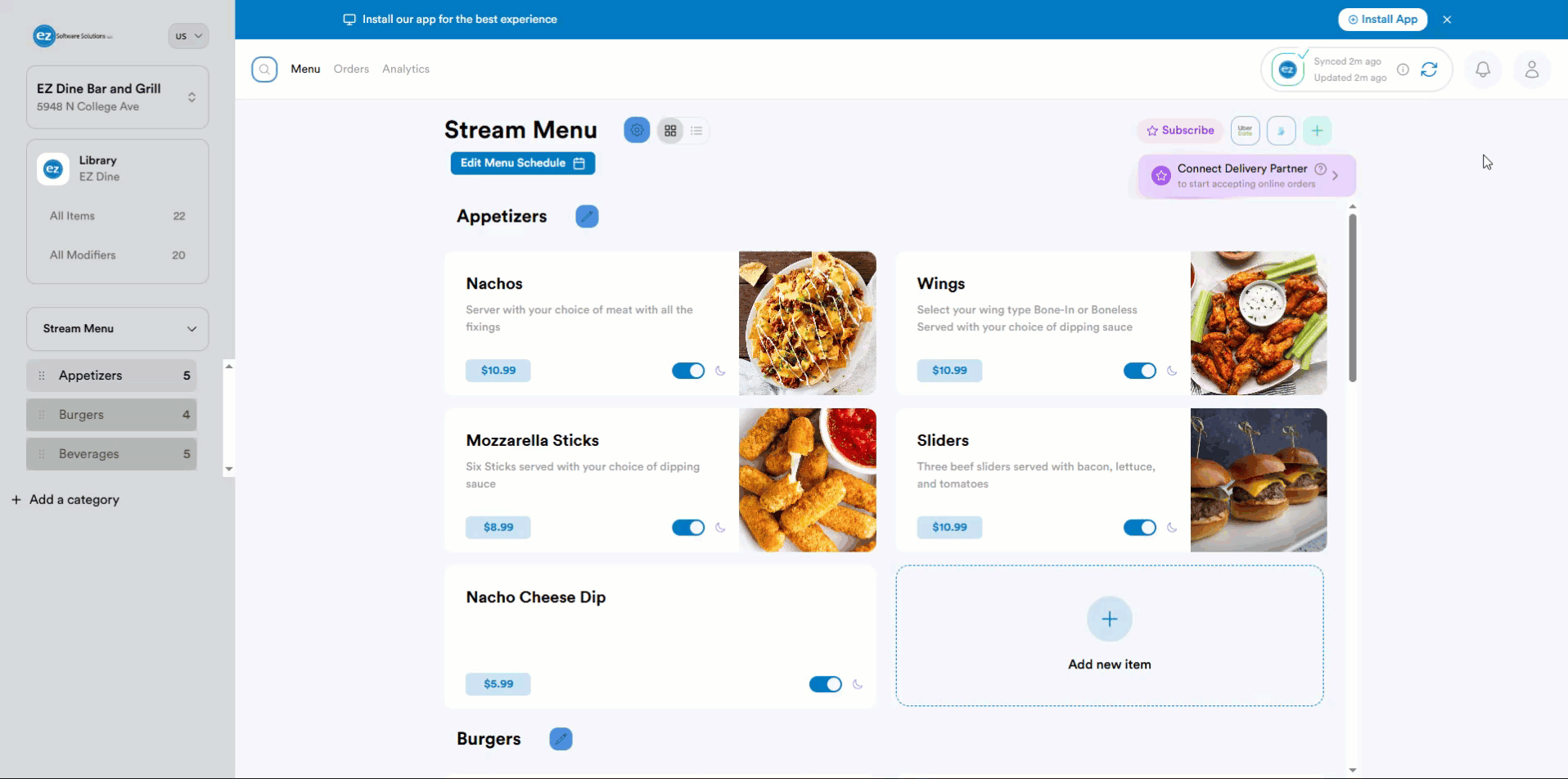 Stream connects and aggregates orders for all major third party food delivery services (Doordash, Grub hub, and Uber eats). Through Stream you will be able to manage all menus and orders for each third party DSP from a central location. The EZ Dine Stream integration will automatically process the DSP order to the EZ Dine App. This includes syncing the DSP order information, payments, kitchen printing, and displaying on the KDS screen. The integration eliminates the need for manual order entry or additional tablets and printers used for order fulfillment. An active third party DSP account will be required in order to use the Stream integration